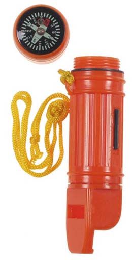 Rikító színű vízhatlan dobozka ami egy vészsíp is egyben, Kupakjában iránytű és tükör, oldalán tűzgyújtó található.doboz mérete: 8 x 3 cmméret: 11,5 x 3 cm