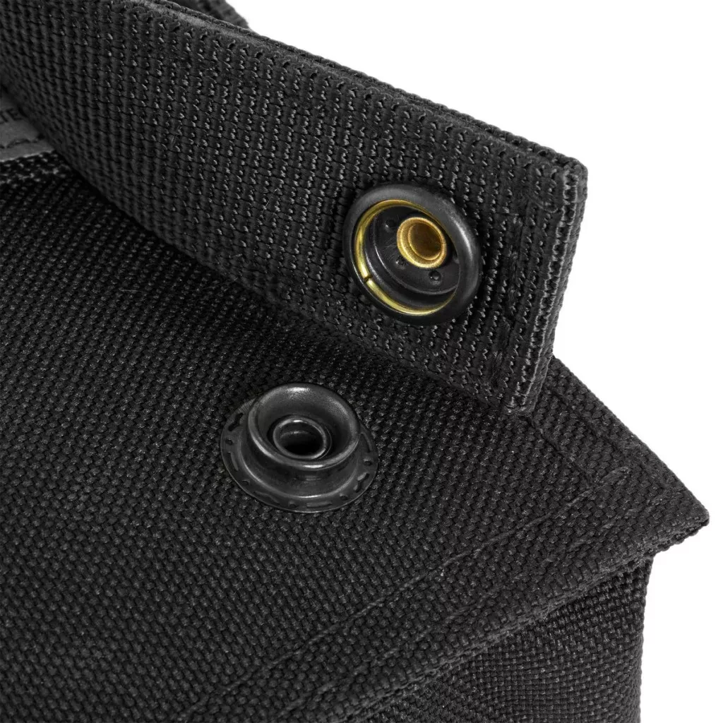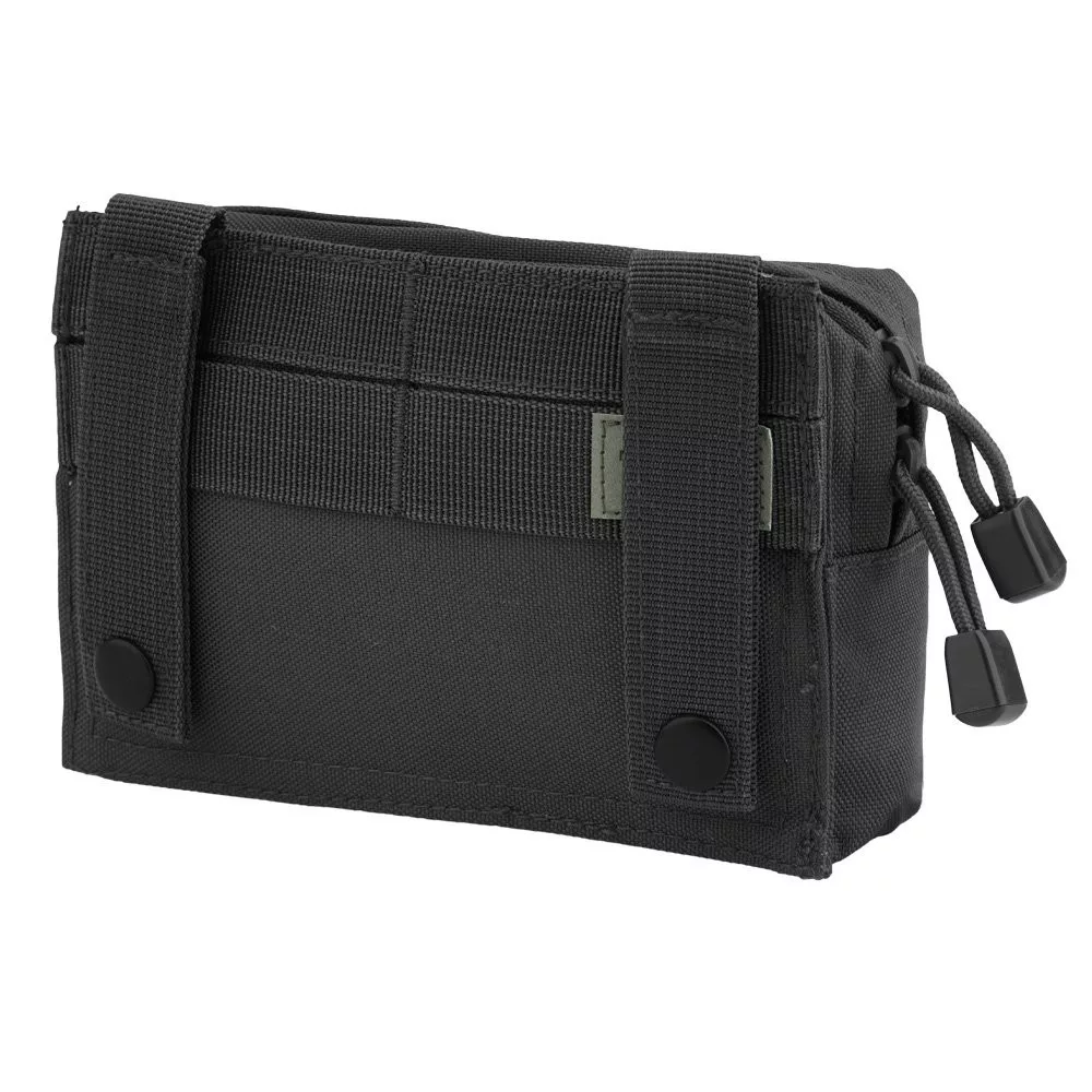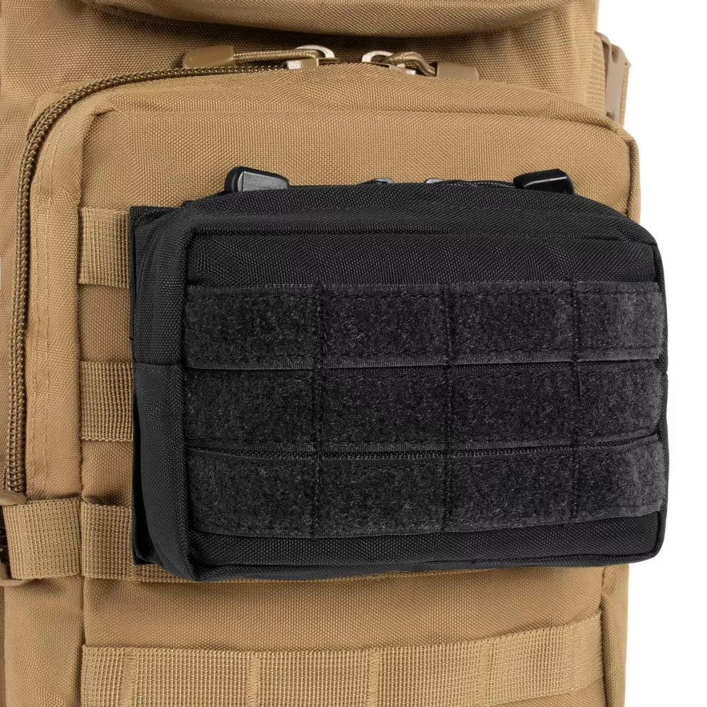 A kétirányú cipzár gyors hozzáférést biztosít, az alsó vízelvezető nyílás pedig segíti a nedvesség távozását. A hátoldalon MOLLE és patentos rögzítőrendszer található övre, hátizsákra vagy mellényre történő rögzítéshez.