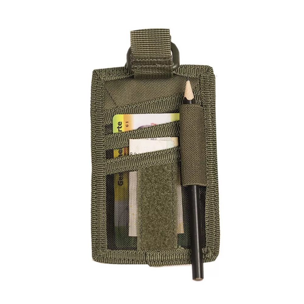 A hátoldalon kialakított kártyatartó rekeszek bankkártyák, belépők vagy igazolványok számára ideálisak, a tolltartó pedig tovább növeli a funkcionalitást. A zöld szín jól illeszkedik katonai, túra- és munkaruházathoz.